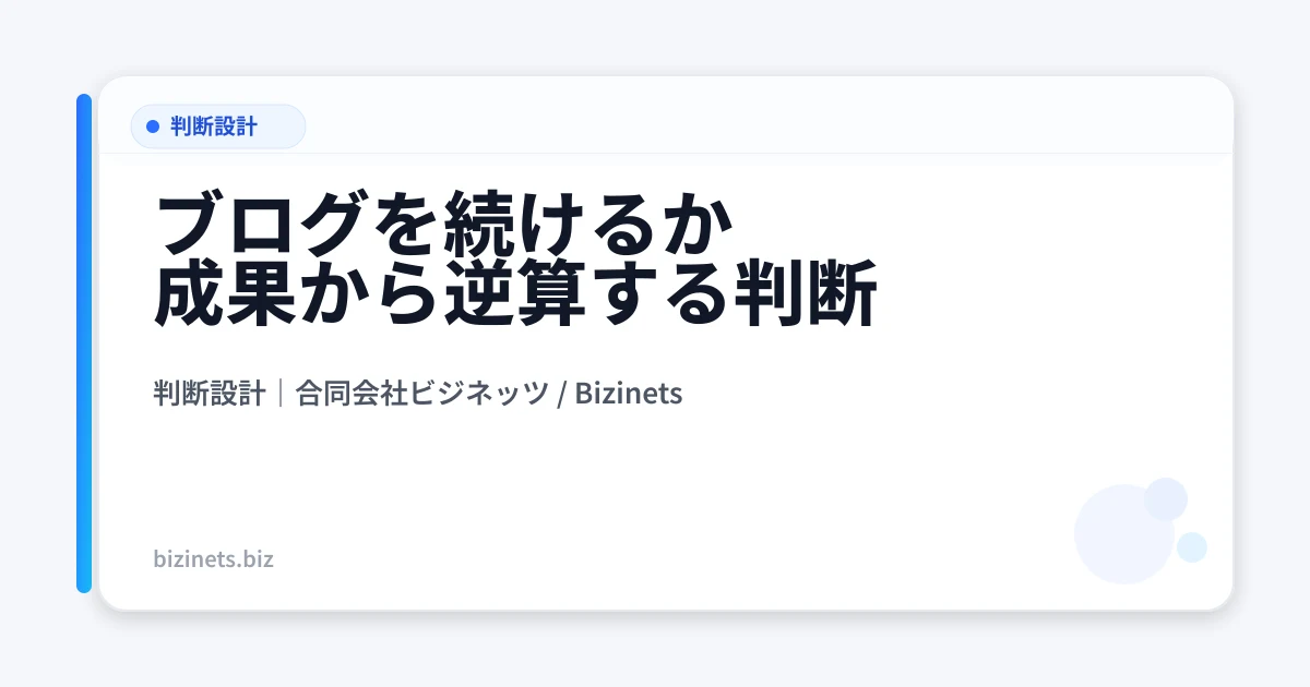 やめるかどうかより先に、テーマを「副業おすすめ」から「副業ブログの判断設計」に絞り直したところ、KWが「ブログ 判断基準」系に集約され、3ヶ月後に検索流入が月300セッションを超えました。